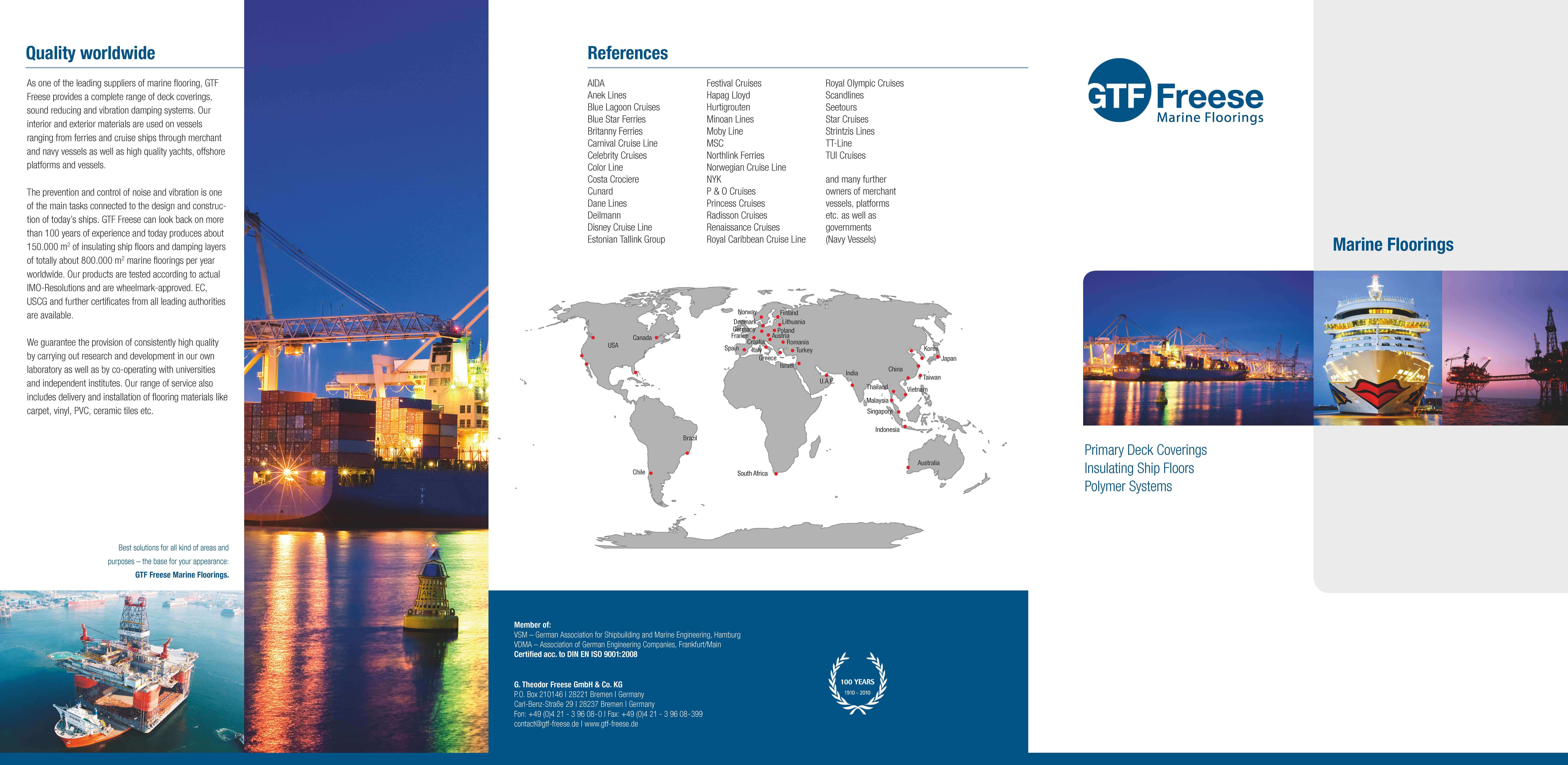 Cassen Behrends Freese, 東弗裡斯蘭帆船家族的兒子, 於1910年在不來梅創建了一個 "技術服務業務" 專門提供船舶和鍋爐清潔的家族企業。 從這個小型家族企業, G. Theodor Freese 有限公司發展成為一個國際性的企業, 專門從事船舶防腐蝕、船舶甲板敷被系統和表面技術。當他在1910年創辦公司時, Cassen Behrends Freese 展示了創業願景和敢於冒險的意願, 他的勇氣使我們現在可以自豪地回顧過去100年的公司歷史。